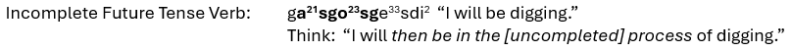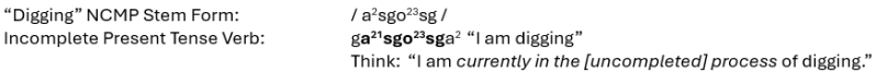 The NCMP Stem Form is frequently seen with the Motion Focus Root Suffix /h/ or the Subject-Object Root Suffix /sg/. Because of the “in-process” character of NCMP forms, emphasizing the motion of the action with /h/ makes sense intuitively. The /h/ Root Suffix is especially common in the Present Continuous subcategory of NCMP Stems—in those cases, it’s very common for the Root Suffix to Shift to Subject-Object /sg/ in non-present tense NCMP Stem uses. The Subject-Object Root Suffix’s relationship to NCMP forms is a bit less intuitive—my best guess is that there’s something about the “cause-and-effect” element of an action that is considered somehow inherently dynamic or in motion to Kituwah thought, and that dynamic quality is associated with the in-progress aspect of Incompletive Ideas.