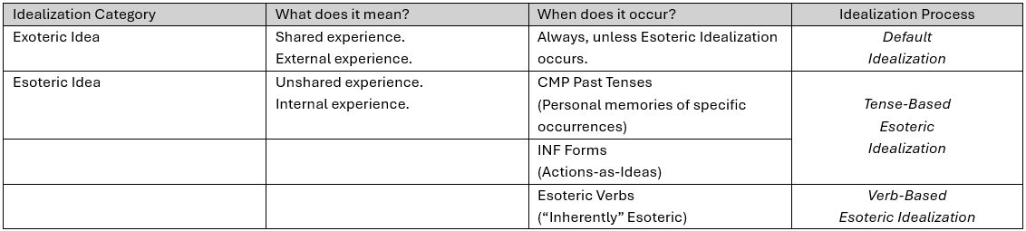 So it begs the question—can we fairly label any verb as a “Exoteric Verb?” Or does Exoteric Idealization simply constitute a default form? In that case, Esoteric Idealization should be understood as a deviation from the Exoteric norm—said deviation based either on tense context (Tense-Based Idealization) or the Verb Root itself (Verb-Based Idealization).